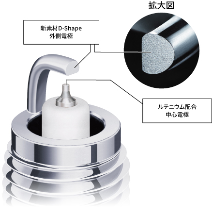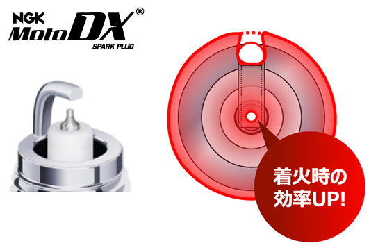 Sebagai busi untuk sepeda motor, NGK meningkatkan berbagai kinerja pada (akselerasi, daya tahan, ketahanan terhadap pengotoran, efisiensi bahan bakar, kemampuan start, dll.). Efisiensi pembakaran yang luar biasa dicapai dengan elektroda luar berbentuk-D (elektroda luar Bentuk-D) dan elektroda tengah yang mengandung rutenium.