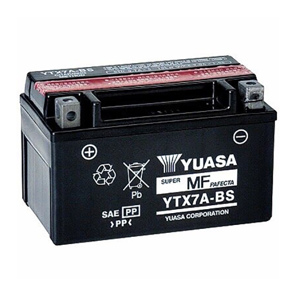 Baterai Yuasa YTX7A-BS Maintenance Free – Baterai dengan teknologi terbaru YUASA bebas perawatan dan umur pemakaian lebih panjang dibanding type konvensional, mempunyai kinerja lebih tinggi untuk memenuhi kebutuhan kelistrikan sepeda motor. Bebas korosi serta segel pemanent tanpa harus mengisi air sebagai perawatan dan anti bocor.