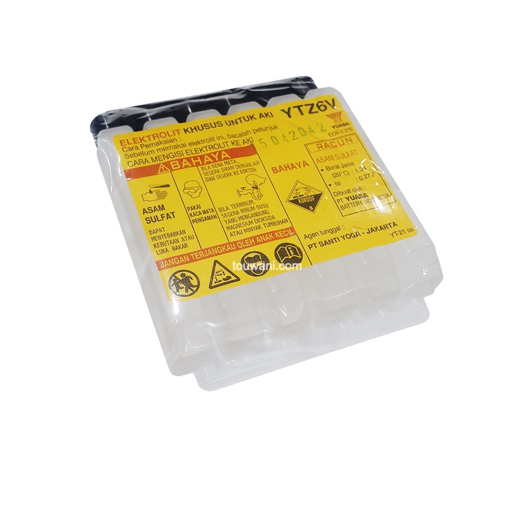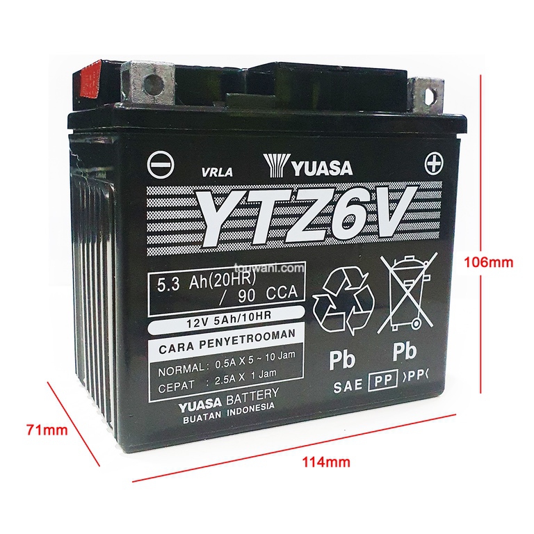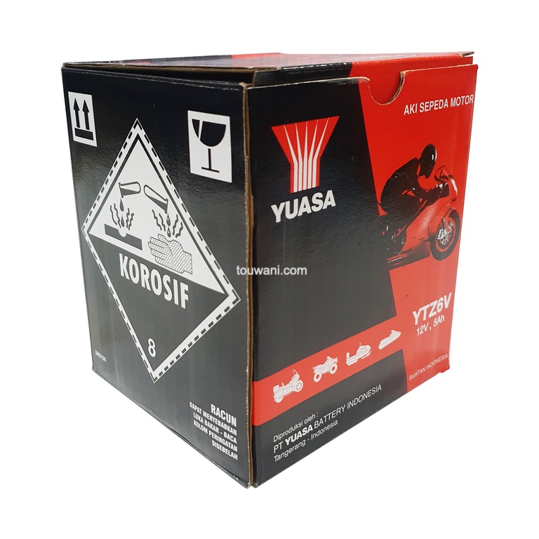 Baterai Yuasa YTZ6V Kinerja Tinggi Bebas Perawatan – Baterai dengan teknologi terbaru YUASA bebas perawatan dan umur pemakaian lebih panjang (awet) dibanding type konvensional, mempunyai kinerja lebih tinggi untuk memenuhi kebutuhan kelistrikan sepeda motor. Bebas korosi serta segel penutup pemanen tanpa harus mengisi air sebagai perawatan dan anti bocor.
