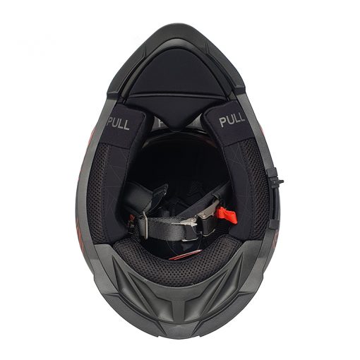 Sistem rilis darurat memungkinkan responden darurat untuk melepas bantalan pipi dari helm, yang memungkinkan ruang ekstra untuk melepas helm dengan gerakan minimal terhadap kepala dan leher pengendara apabila terjadi kecelakaan. Cara terbaik dengan cara seseorang memegang helm, untuk menjaga gerakan saat bantalan helm dilepas. Geser jari Anda ke dalam panel PULL dan tarik dengan hati-hati, bantalan akan terlepas secara mudah.