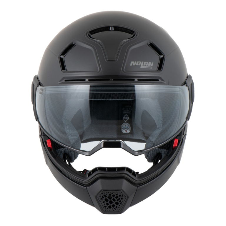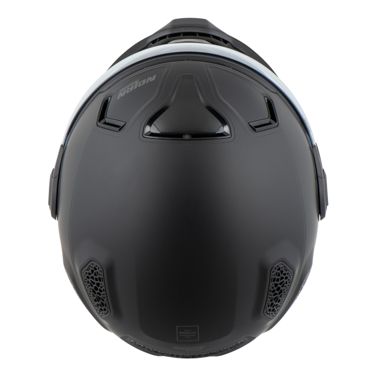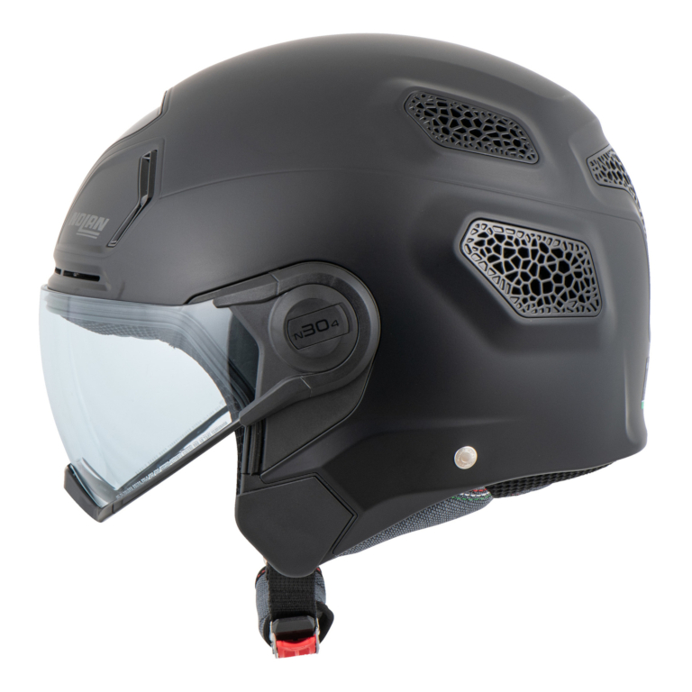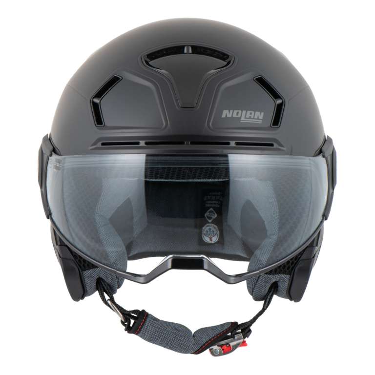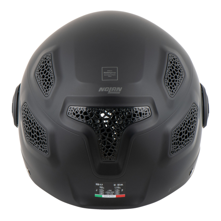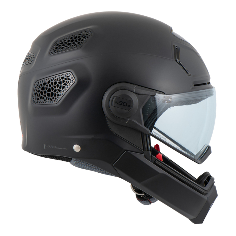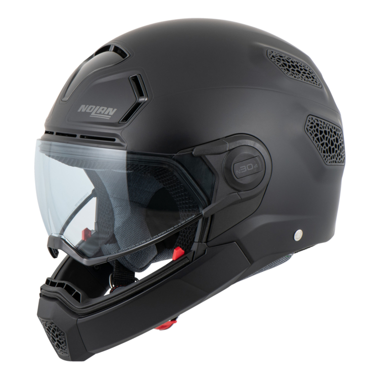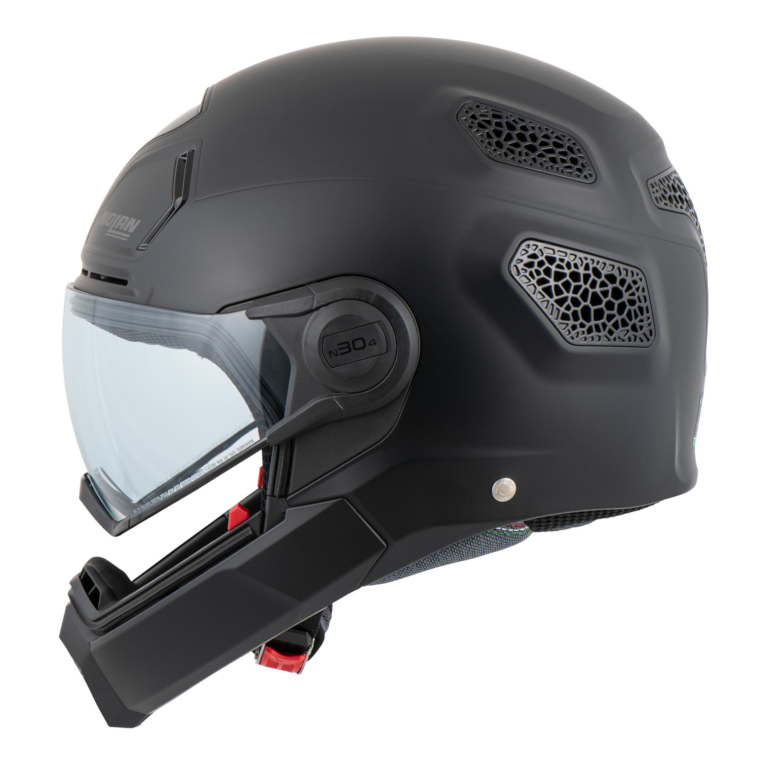Style helm Nolan N30-4 TP menggabungkan visor berbentuk goggle sporty dan fashionable dengan proteksi yang ditawarkan oleh pelindung dagu yang dapat dilepas.