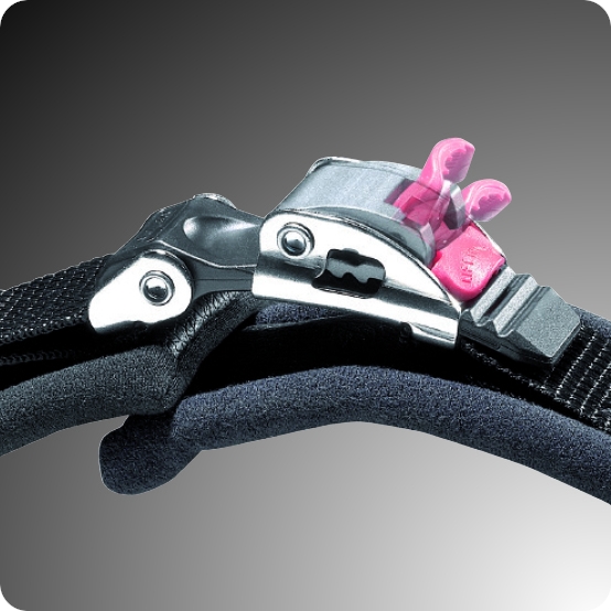 Ini adalah sistem retensi tuas ganda dengan penyesuaian mikrometri, terdiri dari tuas pembuka ergonomis termoplastik, dan tuas bergigi dan penahan aluminium kedua. Tuas bergigi melepaskan strip mikrometri, sehingga tali dagu hanya dapat dibuka dengan putaran tuas pembuka yang sangat lebar. Perangkat ini meminimalkan kemungkinan pembukaan yang tidak disengaja.