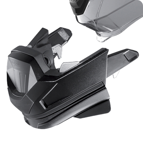 Helm dapat digunakan dengan pelindung dagu terbuka (konfigurasi J) atau tertutup (konfigurasi P), karena pelindung dagu telah lulus uji homologasi yang disyaratkan oleh standar UN/ECE untuk helm full face.2 – Visor Lebar